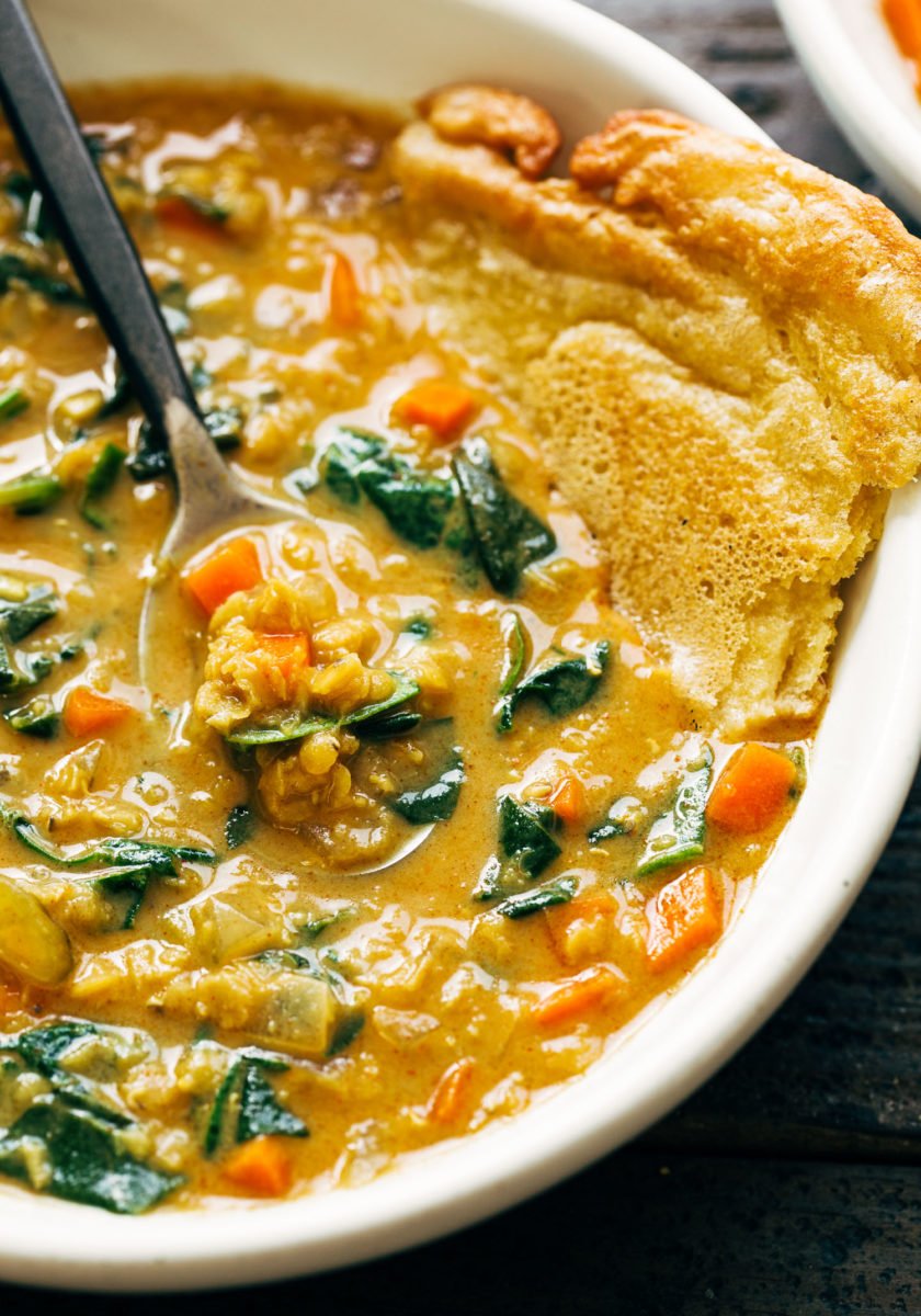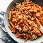 Silky carrot soup topped with spiced ground beef and toasty pine nuts! Bright, savory, warming, all the best things!