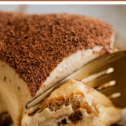 I’d recommend popping this in the fridge for a minimum of 4 hours, but ideally more like 12-24 hours for the best consistency to serve. It’ll set and get easier to cut and serve in clean slices as it chills in the fridge – plus, those ladyfingers will absorb some moisture and the whole thing is just so divine.