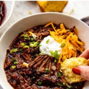 - Serve: Shred the beef into big tender chunks (you should be able to do this directly in the slow cooker) and season with more salt to taste. Serve with sour cream, cheddar, green onions, and cornbread.